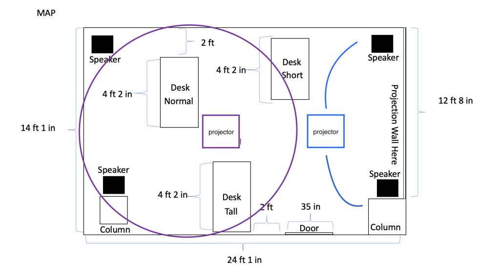 Below is the floor plan for the room. I thought about using three different height desk. The first one you sit on the floor. The second one is standing. The third one has a stool. The reason is that the physical space is mirroring a journey. By sitting down, it is imitating both the floor tables for eating, but it also puts the person lower to the ground, which I think about the idea of safety or fear demonstrated through the body. With the standing desk, the scene being interacted in is the library. The dragon is posing questions, so I want the person to be in an active position. With the sitting, it is more neutral and the rest of the sequence requires thought.