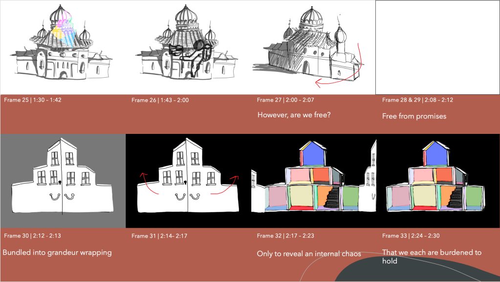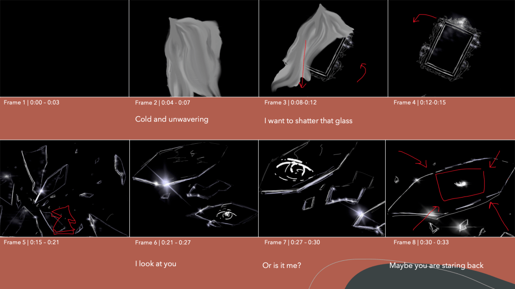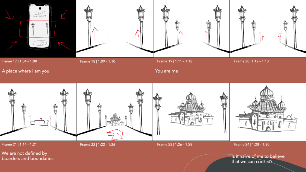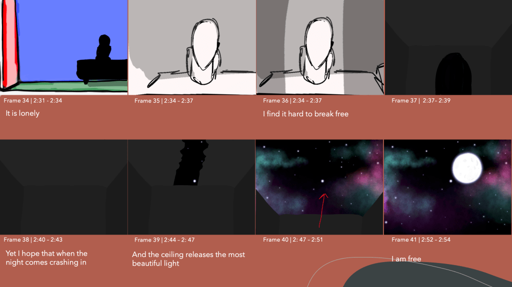 Poetic inquiry has been a valuable tool when developing ideas for animation. It has allowed me to keep long stories short and allowed me to probe at more abstract feelings and emotions. This project started as a poem, where I was examining my feelings around being biracial and the tension happening around the world at the start of COVID. This animatic went through many iterations to create more engaging timing and imagery.