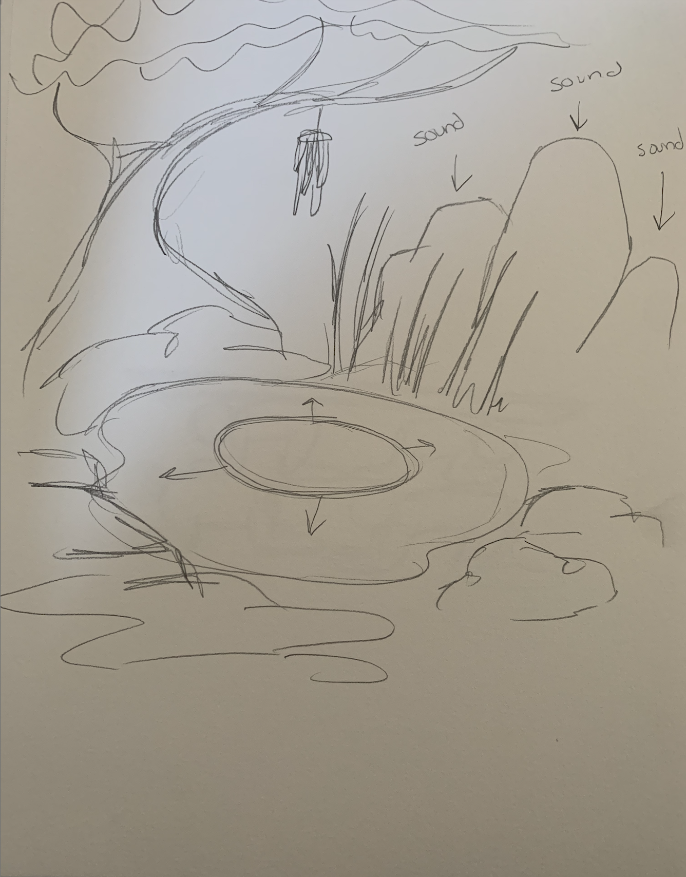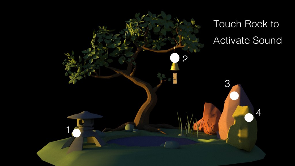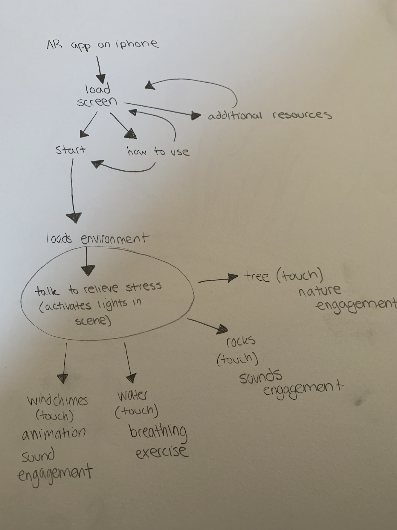 Below are the initial sketches I did to start visualizing the space of our application as well as how the user interacts. Right away, a home screen allows new users to access how the space works. Old users can hop right into the space and begin meditation. All users also have access to additional resources that can allow them complete control over their times of stress. Through this app, an interactive garden – based off of Japanese gardens – is mapped into the desired spot of the user. Rocks become buttons to channel music. The pond becomes a guide to breathing. The tree and wind chimes help you to unlock a state of serenity.