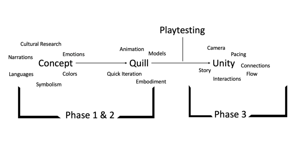 This process involved working in the 3D virtual environment and switching the the flat space of a desktop. I think being able to embody and create and move to create physical assets generated a freedom and expression that I would not have achieved in Maya. As I worked through each phase of modeling, animating, and interacting, I learned and developed at each stage and the direction had to be flexible to accommodate so many changes. Honestly, after this experience, I would do it all over again, and I really love working with Quill.